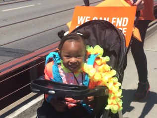 Jane Holt “marched” in her wheelchair for the youths she has seen injured by gun violence at San Francisco General Hospital, where she worked for years as a nurse practitioner. From her wheelchair, Holt marched her legs along the ground for the full two-mile bridge span (back and forth) to keep pace with the other protesters. “There’s been a lot gun violence where I worked. I think we need better laws. We need better regulation. And we need people to realize that we don’t need semi-automatic weapons for anything, not even hunting.”