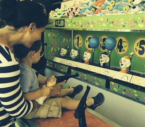 My 7-year-old twin sons were gawking at the black plastic guns in the shooting range at the Mill Valley Carnival. It’s a game as old as American carnivals themselves. A row of toy guns shoot water into the lipsticked mouths of clowns. The carny was barking, “One shot for $3! Two for five!” I watched my little boys take in the big boys, the guns, the wall of toys, and I felt my maternal power dwindle in the face of such a compelling lure. My sons know how I feel about gunplay, yet the more I forbid it, the more their curiosity draws them toward these forbidden objects—the toy version of the lethal instruments at the center of our national debate.